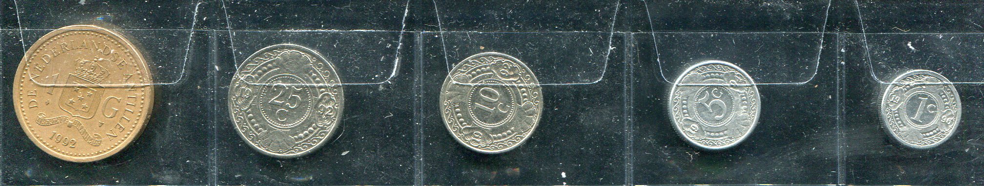 Набор из 5-ти монет Антильские Нидерландские острова. 1 гульден 1992, 25 центов 1992, 10 центов 1992, 5 центов 1994, 1 цент 1996.