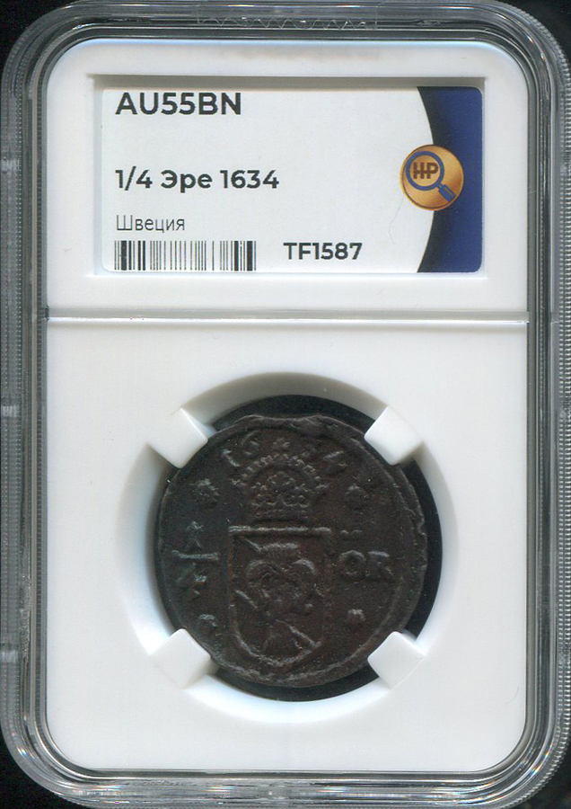 На аверсе изображены три короны и буквы: C(hristina) R(egina) S(veciae) (Кристина королева Швеции).