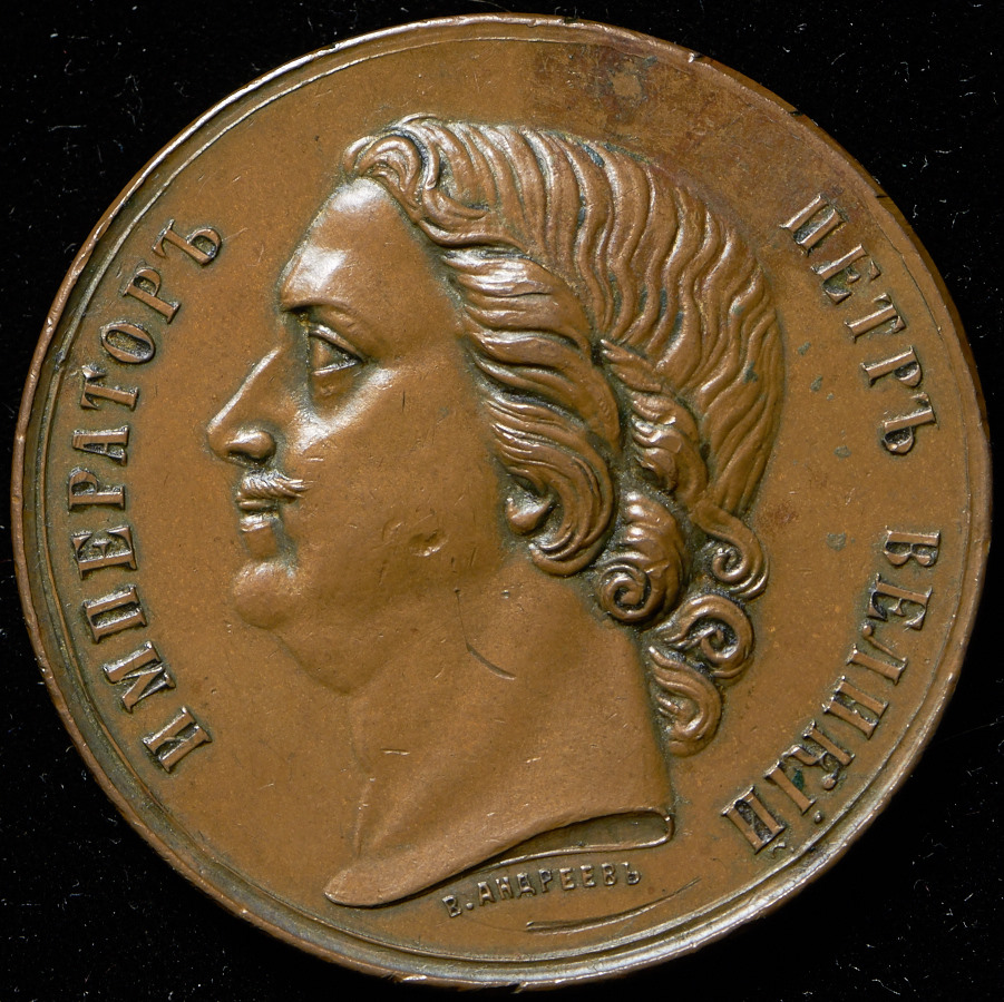 На аверсе изображен портрет Петра I влево, ниже подпись "А. Андреевъ". Круговая легенда "ИМПЕРАТОРЪ ПЕТРЪ ВЕЛИКiЙ".