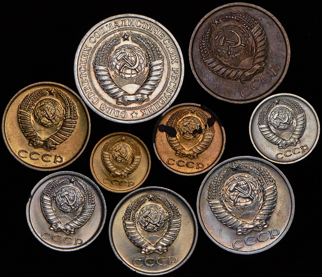 В набор вошли: 1 копека 1977, 2 копейки 1977, 3 копейки 1977, 5 копеек 1977, 10 копеек 1977, 15 копеек 1977, 20 копеек 1977, 50 копеек 1977, 1 рубль 1977.