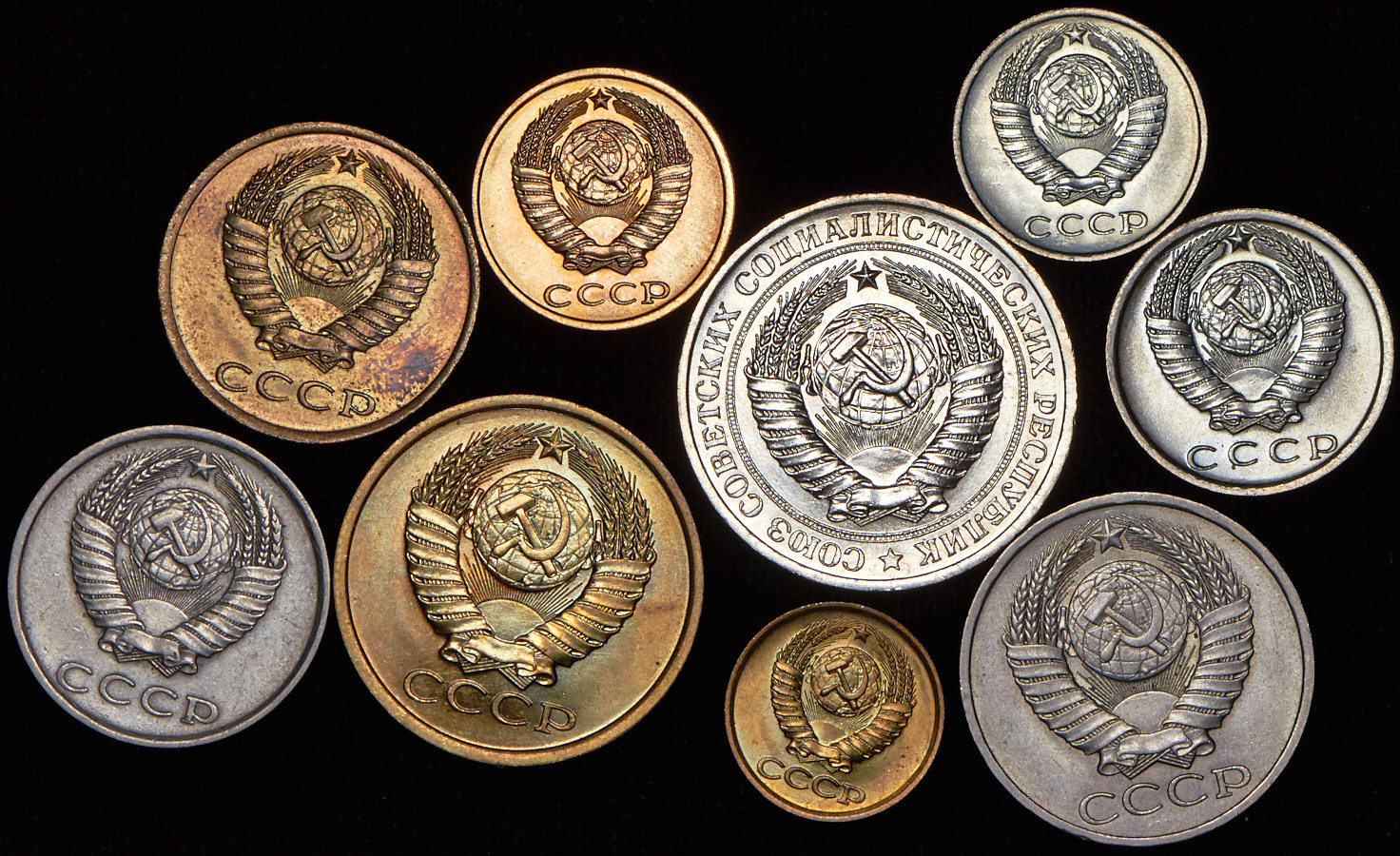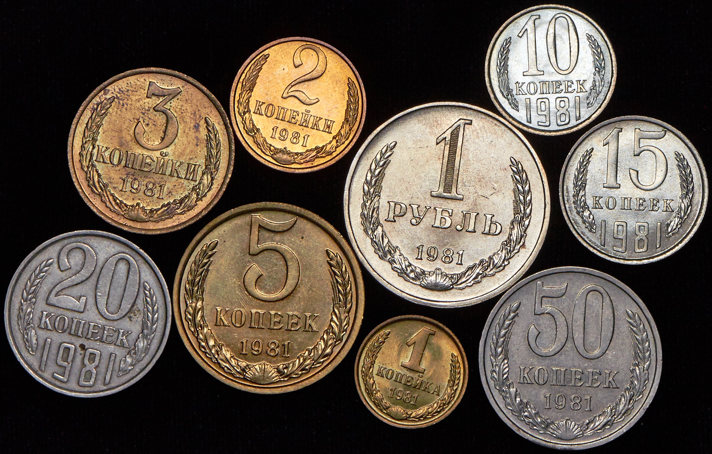 В набор вошли: 1 копека 1981, 2 копейки 1981, 3 копейки 1981, 5 копеек 1981, 10 копеек 1981, 15 копеек 1981, 20 копеек 1981, 50 копеек 1981, 1 рубль 1981