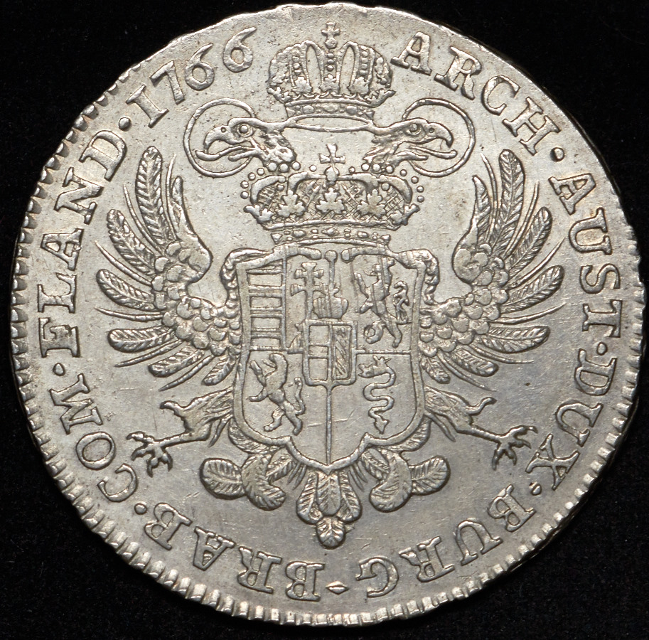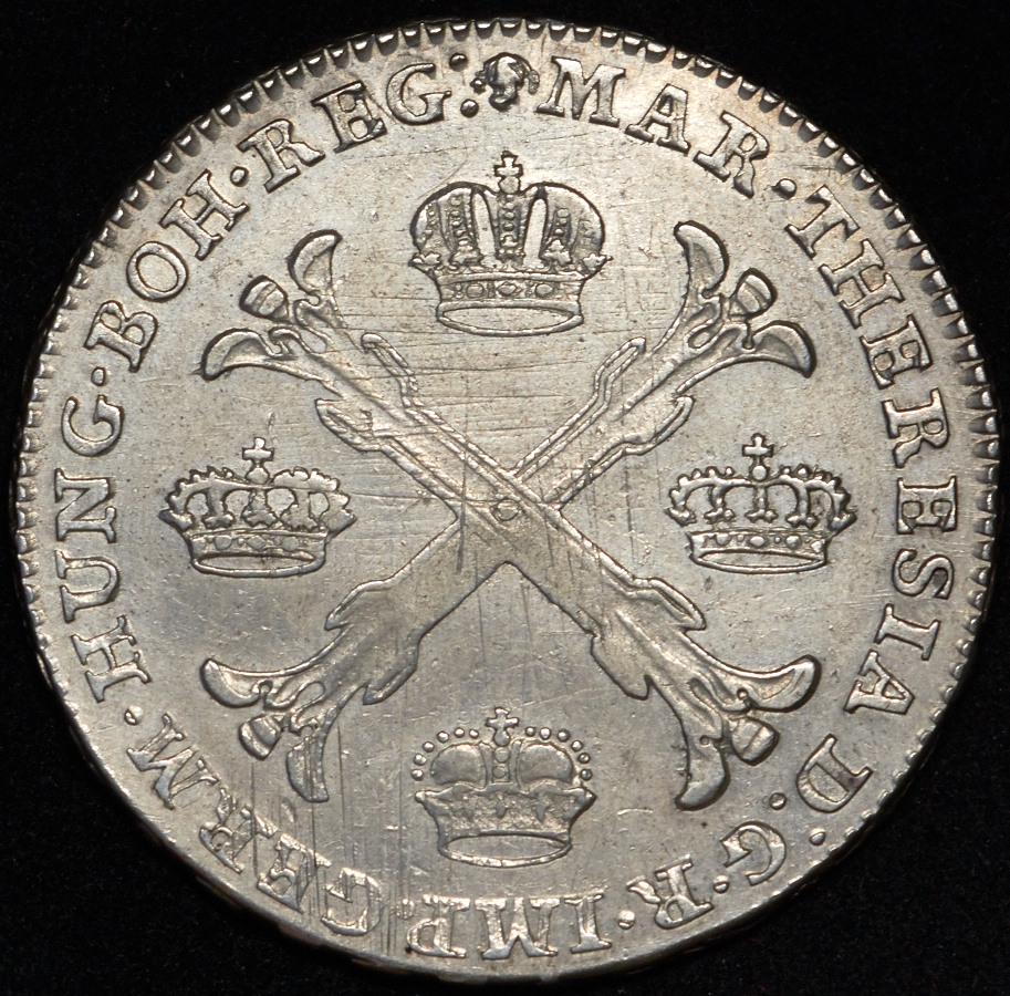Т.н. кроненталер.Австрийские Нидерланды, герцогство Брабант. Мария Терезия.Чеканка Брюссель.Следы юстировки заготовки.