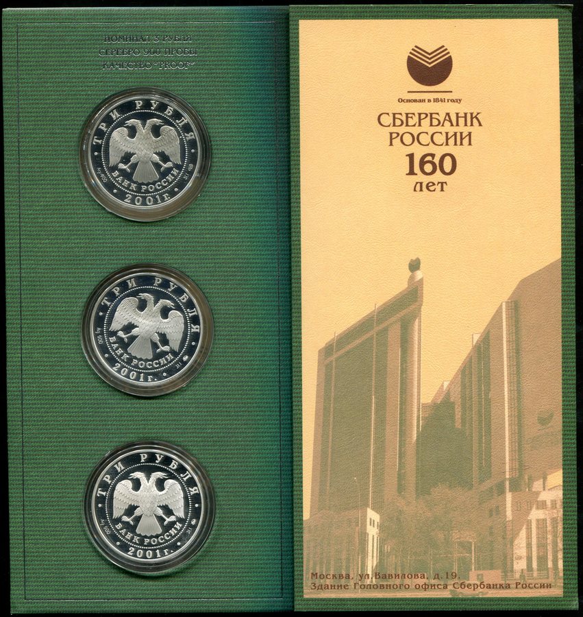 Набор из 3-х сер. монет 3 рубля 2001 "Сбербанк России 160 лет" (в п/у)