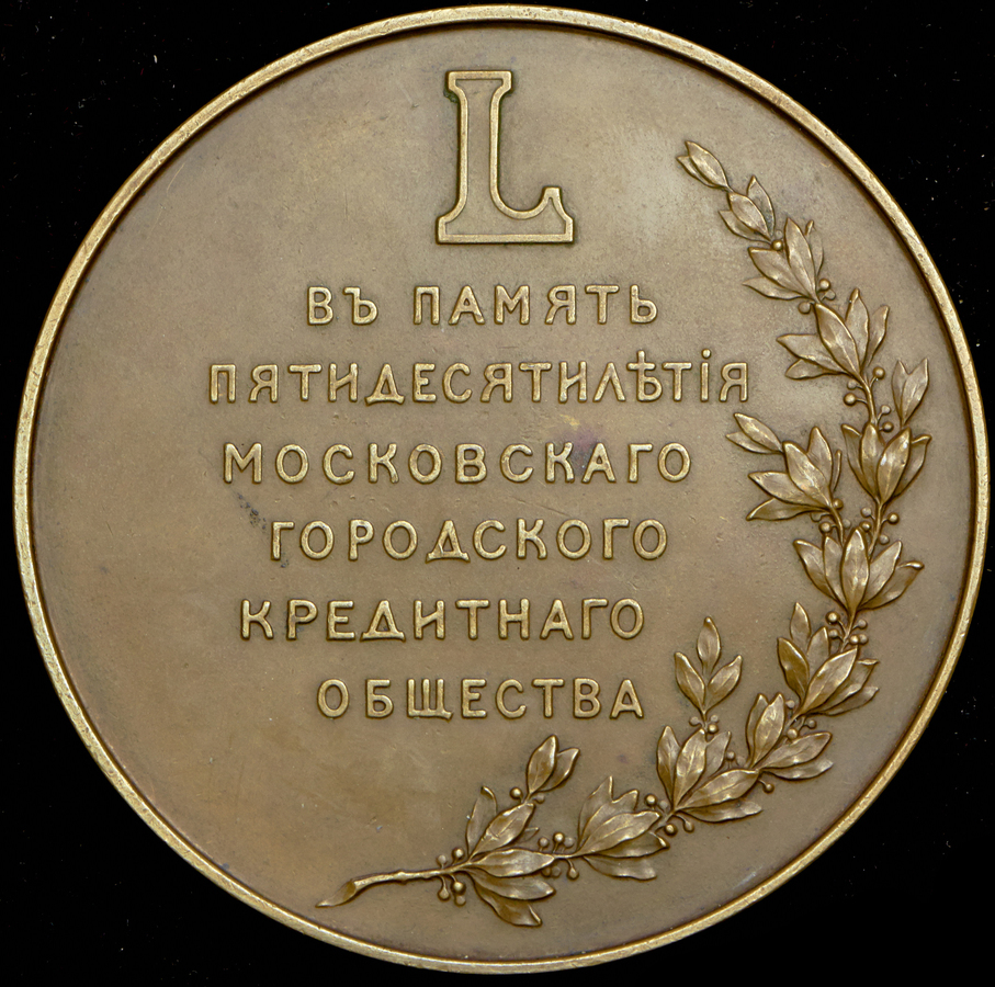 Аверс: 1912 Реверс: ВЪ ПАМЯТЬ | ПЯТИДЕСЯТИЛѢТİЯ | МОСКОВСКАГО | ГОРОДСКОГО | КРЕДИТНАГО | ОБЩЕСТВА