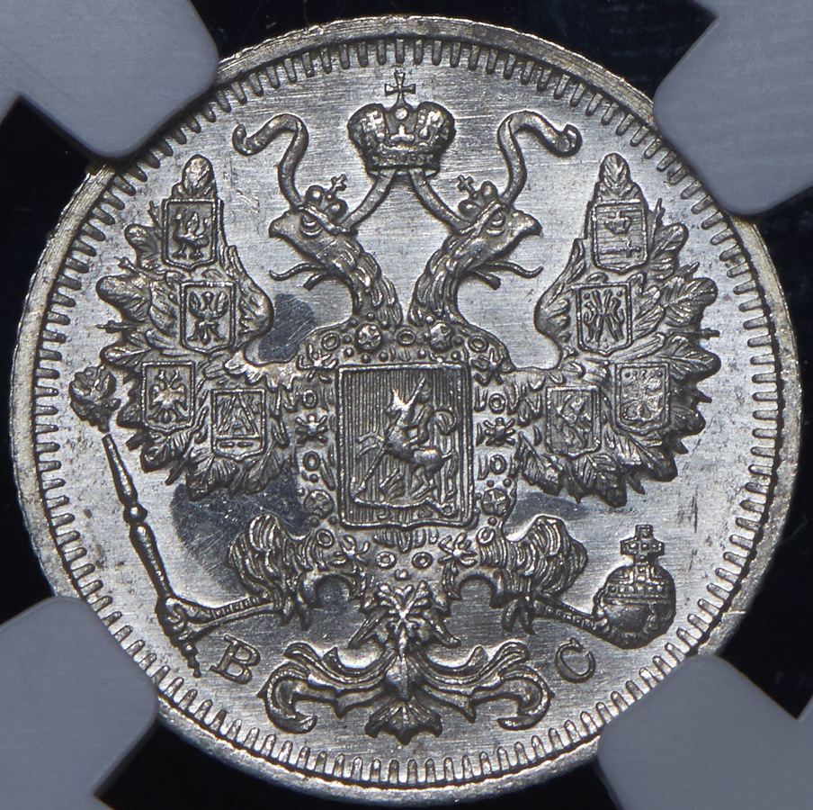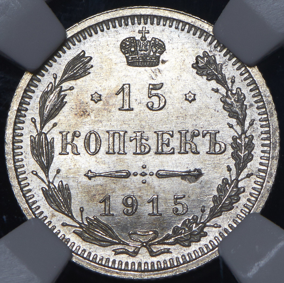 "После начала первой мировой войны, в которой противником России была германия, русской столице в 1915 г. вместо "немецкого" названия - Санкт-Петербург - было присвоено русское - Петроград. В связи с этим со всех русских монет (разменных серебряных и медных) было снято обозначение Петербургского монетного двора - "СПБ" (т.е. "Санкт-Петербург"), однако другого обозначения до 1917 г. так и не было установлено."