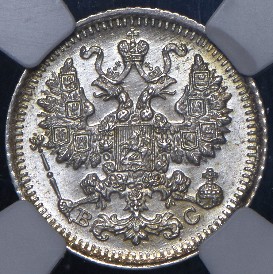 "После начала первой мировой войны, в которой противником России была германия, русской столице в 1915 г. вместо "немецкого" названия - Санкт-Петербург - было присвоено русское - Петроград. В связи с этим со всех русских монет (разменных серебряных и медных) было снято обозначение Петербургского монетного двора - "СПБ" (т.е. "Санкт-Петербург"), однако другого обозначения до 1917 г. так и не было установлено."