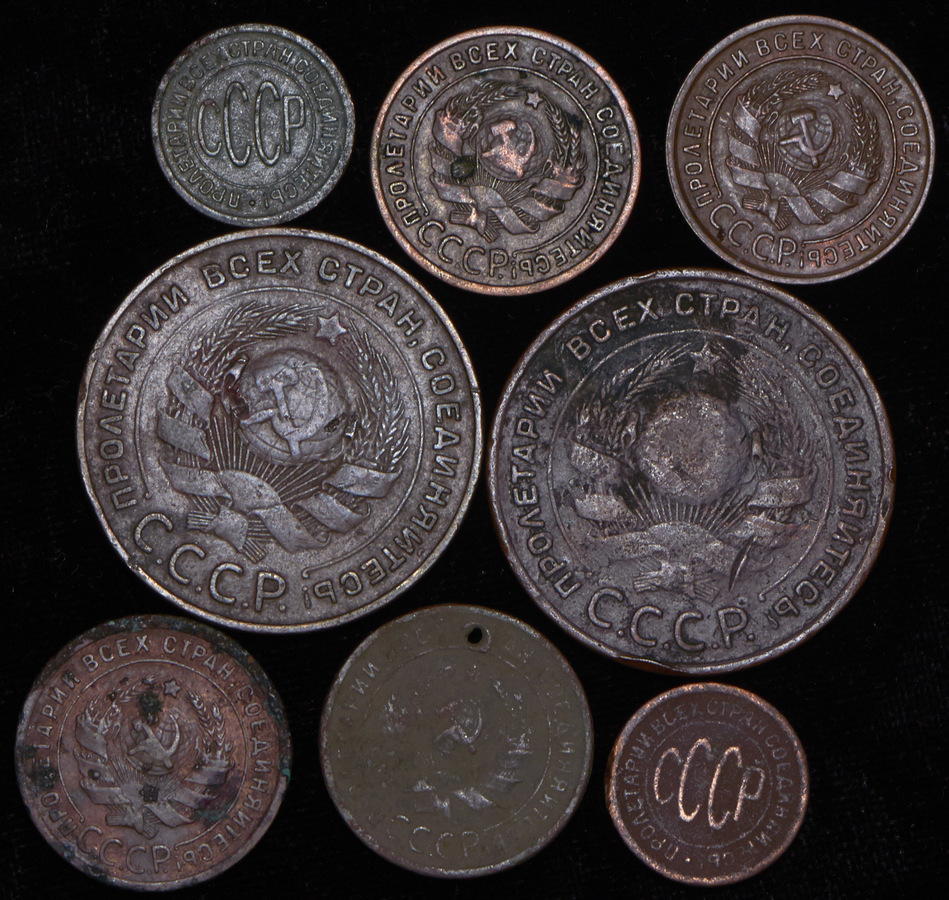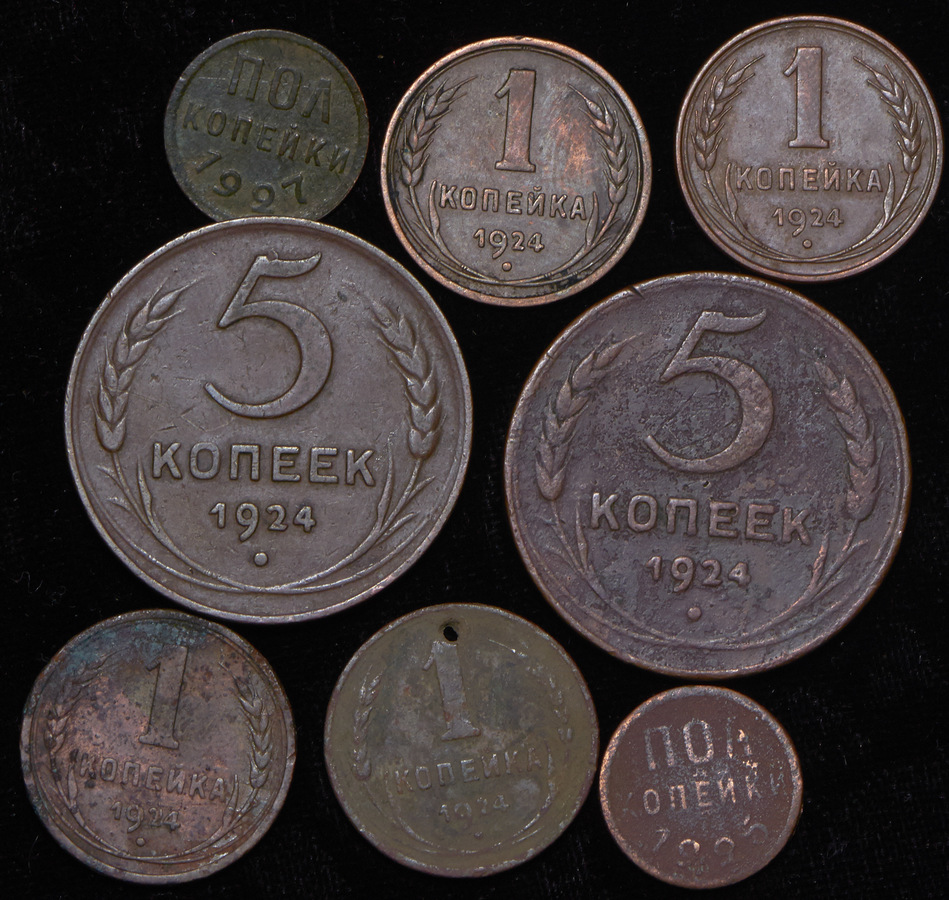 5 копеек 1924 -2 шт. гурт гладкий. 1 копейка 1924 - 4 шт. гурт рубчатый. Полкопейки 1925. Полкопейки 1927