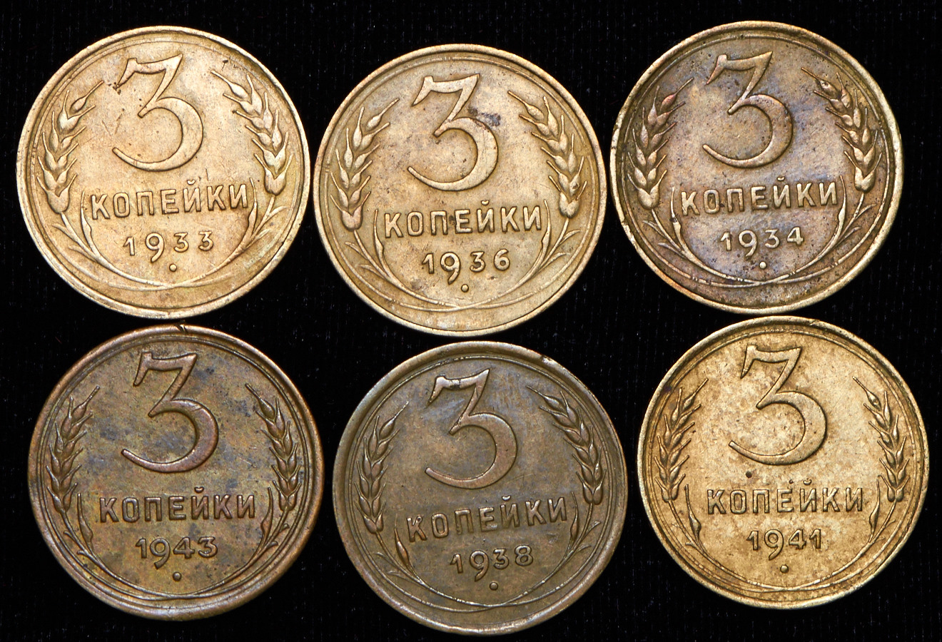 3 копейки 1933, 1934, 1936,1938, 1941, 1943.