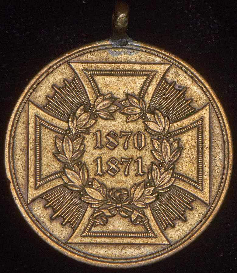 часть креста наложен перевязанный снизу лентой лавровый венок, внутри которого в две строки указаны даты начала и конца войны: “1870 1871”.