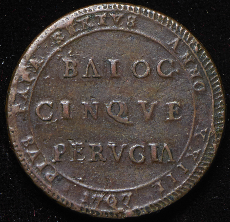 PERVGIA" (пять байочи Перуджа), по кругу "PIVS PAPA SEXTVS ANNO XXIII 1797" (Папа Пий VI год 23-й 1797).