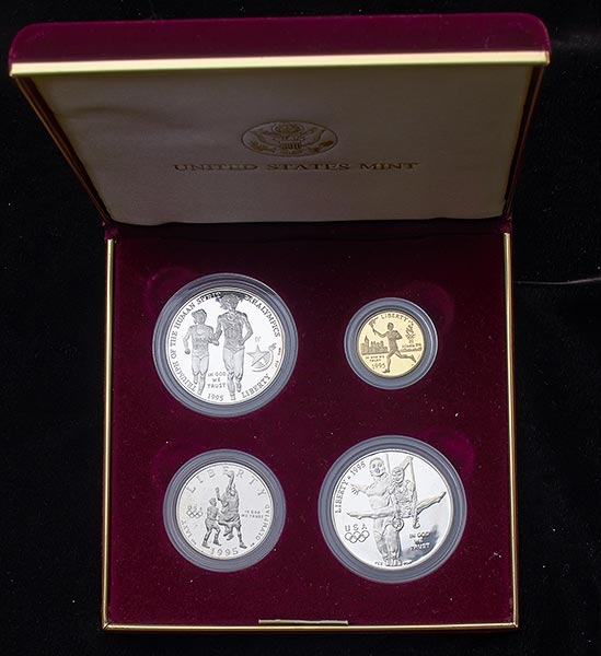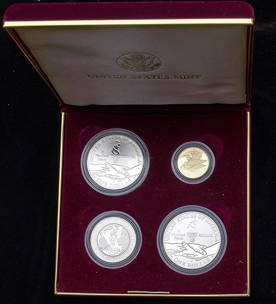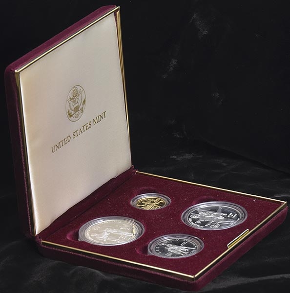 В набор вошли три серебряные и одна золотая монеты.