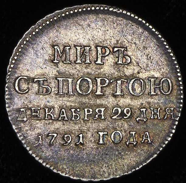 На лицевой стороне вензель Екатерины II внутри лаврового венка. На реверсе: "МИРЪ С ПОРТОЮ ДЕКАБРЯ 29 ДНЯ 1791 ГОДА".