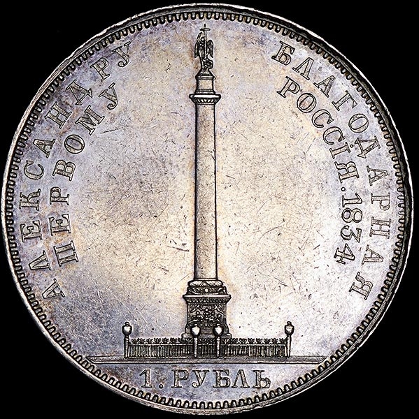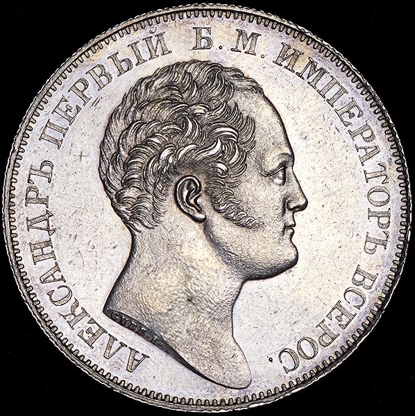 Чеканен по случаю открытия Александровской колонны в Санкт-Петербурге. "GUBE.F." в обрезе шеи. Следы реставрации.