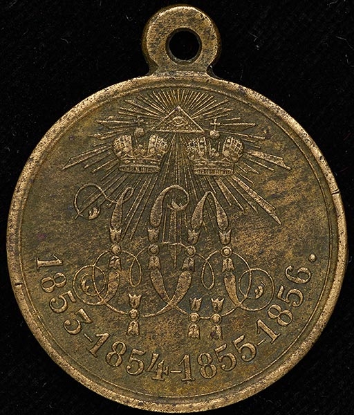 Медаль "В память войны 1853—1856" — массовая высочайше утверждённая награда Российской империи. Учреждена в ознаменование завершения Крымской войны (1853—1856) и по случаю коронации Александра II.¶Светлая бронза.¶Следы чистки. Реставрация ушка.¶¶Медалью «В память войны 1853—1856» награждался широкий круг лиц, как воевавших на Крымской войне, так и находившихся в тылу. Рисунок медали был утверждён ещё 30 марта 1856 года. Медаль была официально учреждена 26 августа 1856 года Александром II в специальном манифесте «О Всемилостивейшем даровании народу милостей по случаю Коронования Его Императорского Величества». Медаль имела два варианта: светло-бронзовый и тёмно-бронзовый, кроме того, имелась градация по типу ленты для ношения.
