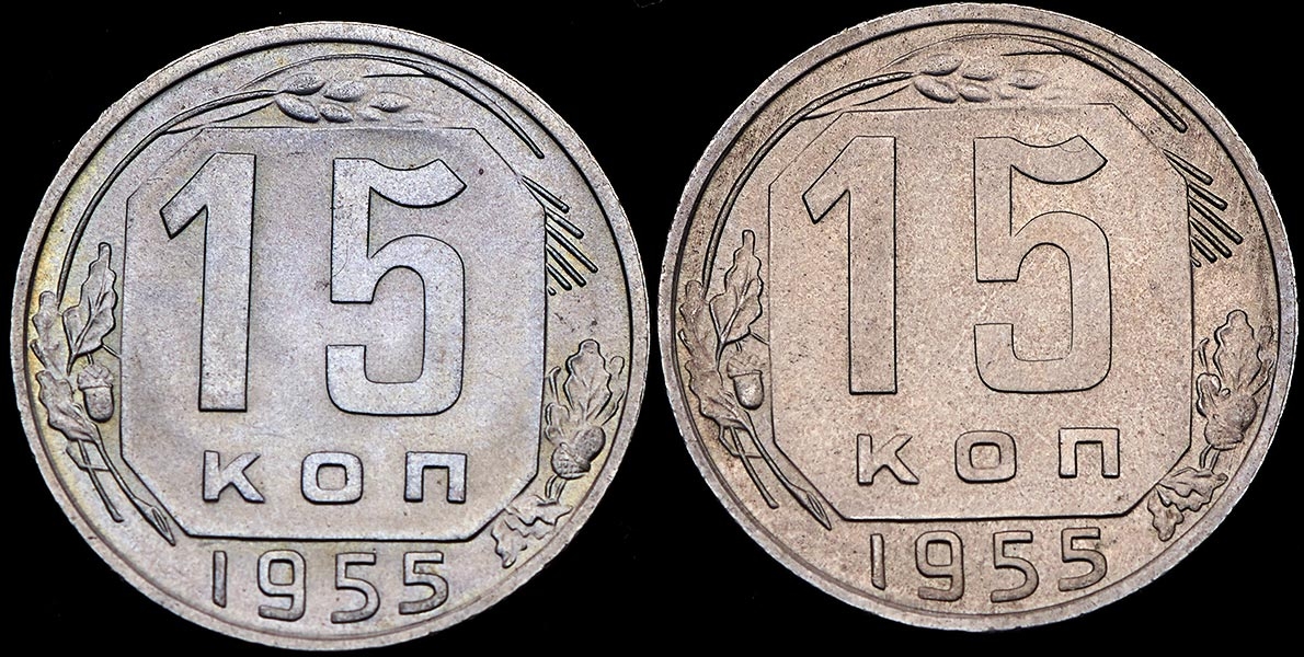 Набор из 2-х монет 15 копеек 1955 г. Все разновидности.