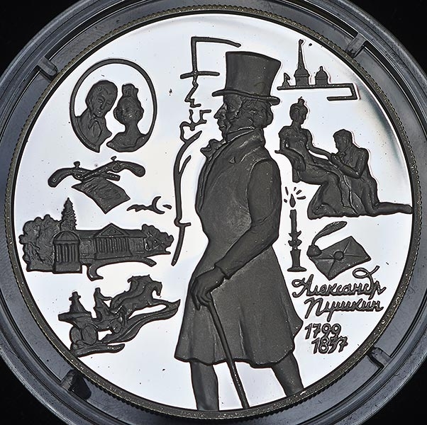 Реверс: Изображение А.С.Пушкина на прогулке с тростью в руке, за ним — стилизованный абрис Онегина, на втором плане слева вверху — двойной портрет в овале, пара дуэльных пистолетов и письмо, внизу — помещичья усадьба, мчащаяся тройка, запряжённая в повозку, справа вверху — очертания Петербурга, сидящая женщина, перед ней — коленопреклоненный мужчина, внизу — свеча в подсвечнике, чернильница с пером, запечатанный конверт, ниже — надпись:«АЛЕКСАНДР ПУШКИН» и даты в две строки «1799» «1837».
