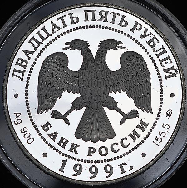Аверс: Вверху вдоль канта номинал «ДВАДЦАТЬ ПЯТЬ РУБЛЕЙ», внизу слева химическое название «Ag» и проба «900» металла, внизу по центру год выпуска «1999 г.», внизу справа чистый вес находящегося в монете драгоценного металла «155,50» и монограмма монетного двора «ММД». В середине в ободке из точек двуглавый орел под ним с внутренней стороны точечного ободка слова «БАНК РОССИИ».