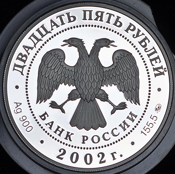 Аверс: Вверху вдоль канта номинал «ДВАДЦАТЬ ПЯТЬ РУБЛЕЙ», внизу слева химическое название «Ag» и проба «900» металла, внизу по центру год выпуска «2002 г.», внизу справа чистый вес находящегося в монете драгоценного металла «155,50» и монограмма монетного двора «ММД». В середине в ободке из точек двуглавый орел под ним с внутренней стороны точечного ободка слова «БАНК РОССИИ».