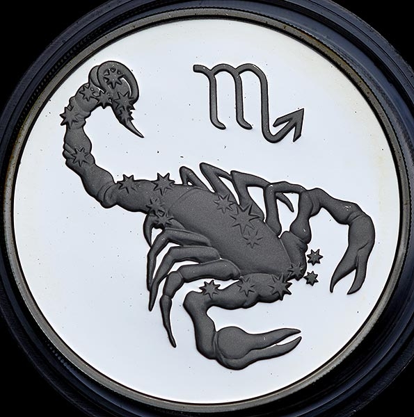 Реверс: Изображение скорпиона на фоне звeзд, вверху - знак зодиакального созвездия Скорпиона.