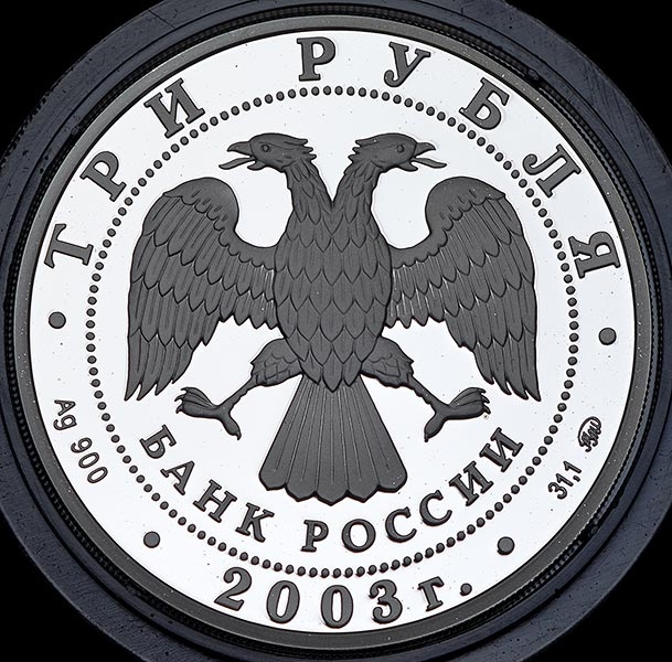 Аверс: Вверху вдоль канта номинал «ТРИ РУБЛЯ», внизу слева химическое название «Ag» и проба «900» металла, внизу по центру год выпуска «2003 г.», внизу справа чистый вес находящегося в монете драгоценного металла «31,10» и монограмма монетного двора «ММД». В середине в ободке из точек двуглавый орел под ним с внутренней стороны точечного ободка слова «БАНК РОССИИ».