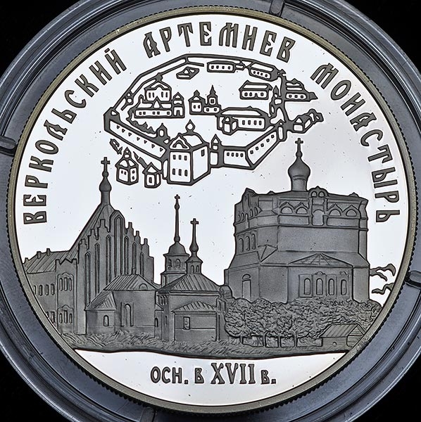 Реверс: Изображение памятников архитектуры Веркольского Артемиева монастыря, над ними – план монастыря, вверху по окружности – надпись: «ВЕРКОЛЬСКИЙ АРТЕМИЕВ МОНАСТЫРЬ», внизу – «осн. в XVII в.».