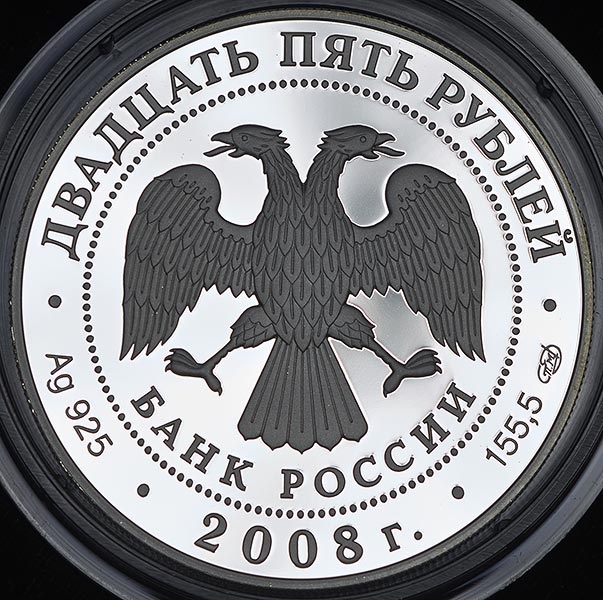 Аверс: Вверху вдоль канта номинал «ДВАДЦАТЬ ПЯТЬ РУБЛЕЙ», внизу слева химическое название «Ag» и проба «925» металла, внизу по центру год выпуска «2008 г.», внизу справа чистый вес находящегося в монете драгоценного металла «155,50» и монограмма монетного двора «СПМД». В середине в ободке из точек двуглавый орел под ним с внутренней стороны точечного ободка слова «БАНК РОССИИ».