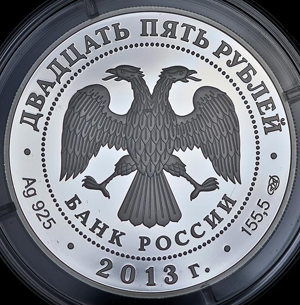 Аверс: Вверху вдоль канта номинал «ДВАДЦАТЬ ПЯТЬ РУБЛЕЙ», внизу слева химическое название «Ag» и проба «925» металла, внизу по центру год выпуска «2013 г.», внизу справа чистый вес находящегося в монете драгоценного металла «155,50» и монограмма монетного двора «СПМД». В середине в ободке из точек двуглавый орел под ним с внутренней стороны точечного ободка слова «БАНК РОССИИ».