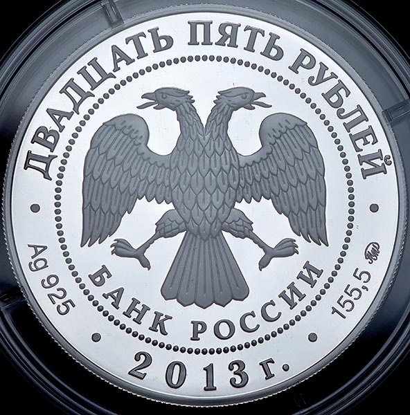 Аверс: Вверху вдоль канта номинал «ДВАДЦАТЬ ПЯТЬ РУБЛЕЙ», внизу слева химическое название «Ag» и проба «925» металла, внизу по центру год выпуска «2013 г.», внизу справа чистый вес находящегося в монете драгоценного металла «155,50» и монограмма монетного двора «ММД». В середине в ободке из точек двуглавый орел под ним с внутренней стороны точечного ободка слова «БАНК РОССИИ».