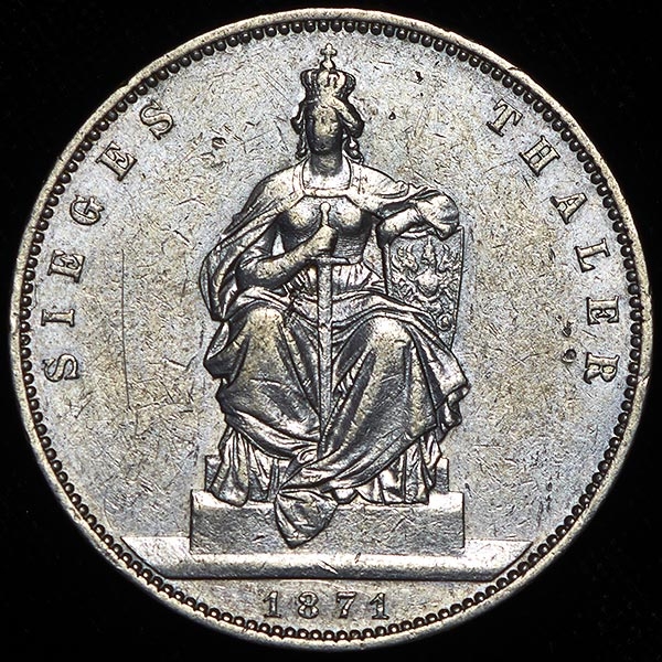 Чеканена в честь победы над французами в франко-прусской войне. Последний талер Пруссии.