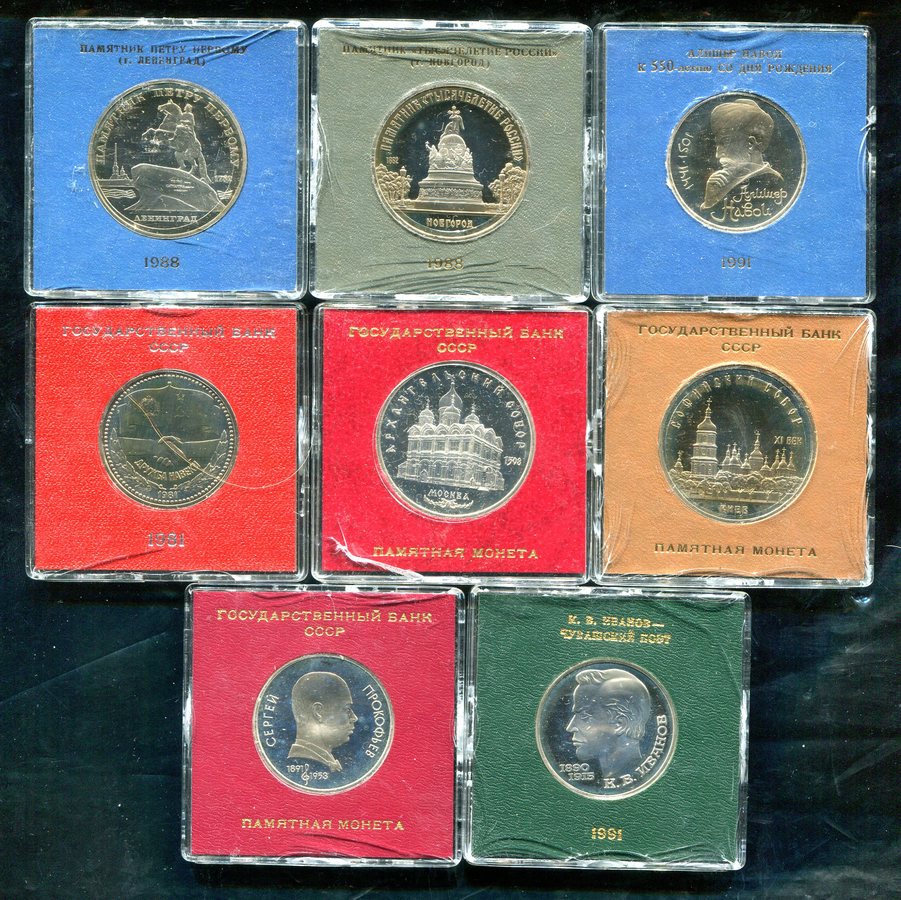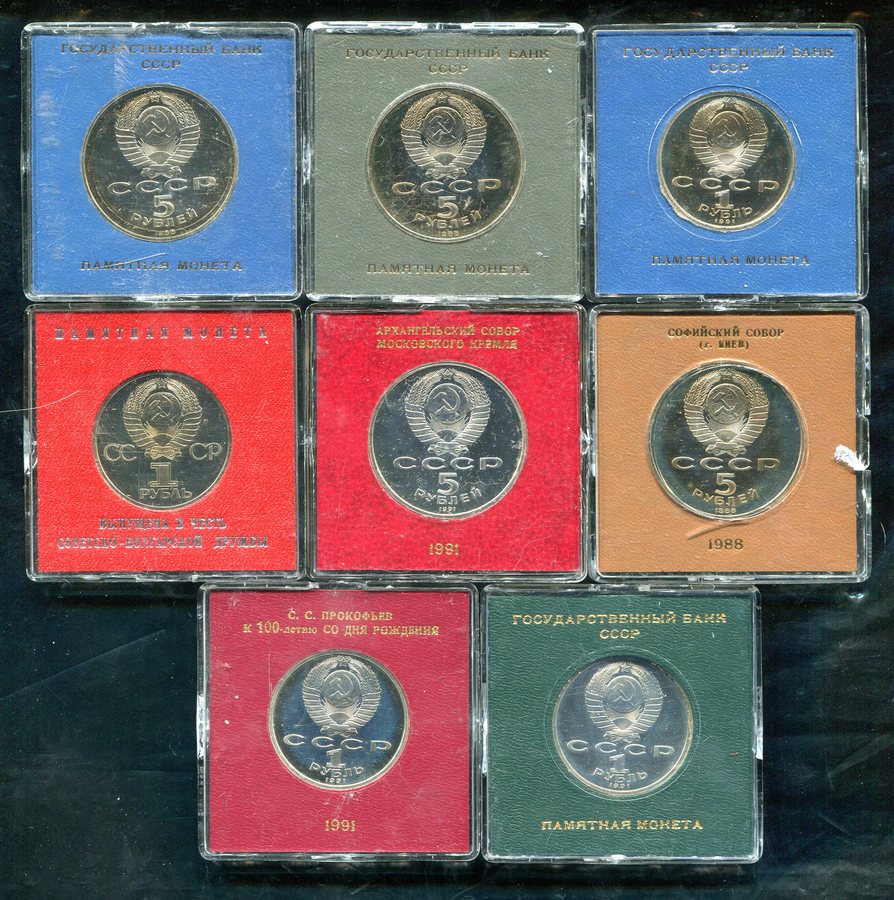 1 рубль 1981 "Советско-Болгарская дружба", 1 рубль 1991 "К.В. Иванов", 1 рубль 1991 "Прокофьев", 1 рубль 1991 "Навои". 5 рублей 1988 "Софийский собор" 5 рублей 1988 "Памятник Петру I", 5 рублей 1988 "Тысячелетие России", 5 рублей 1991 "Архангельский собор".