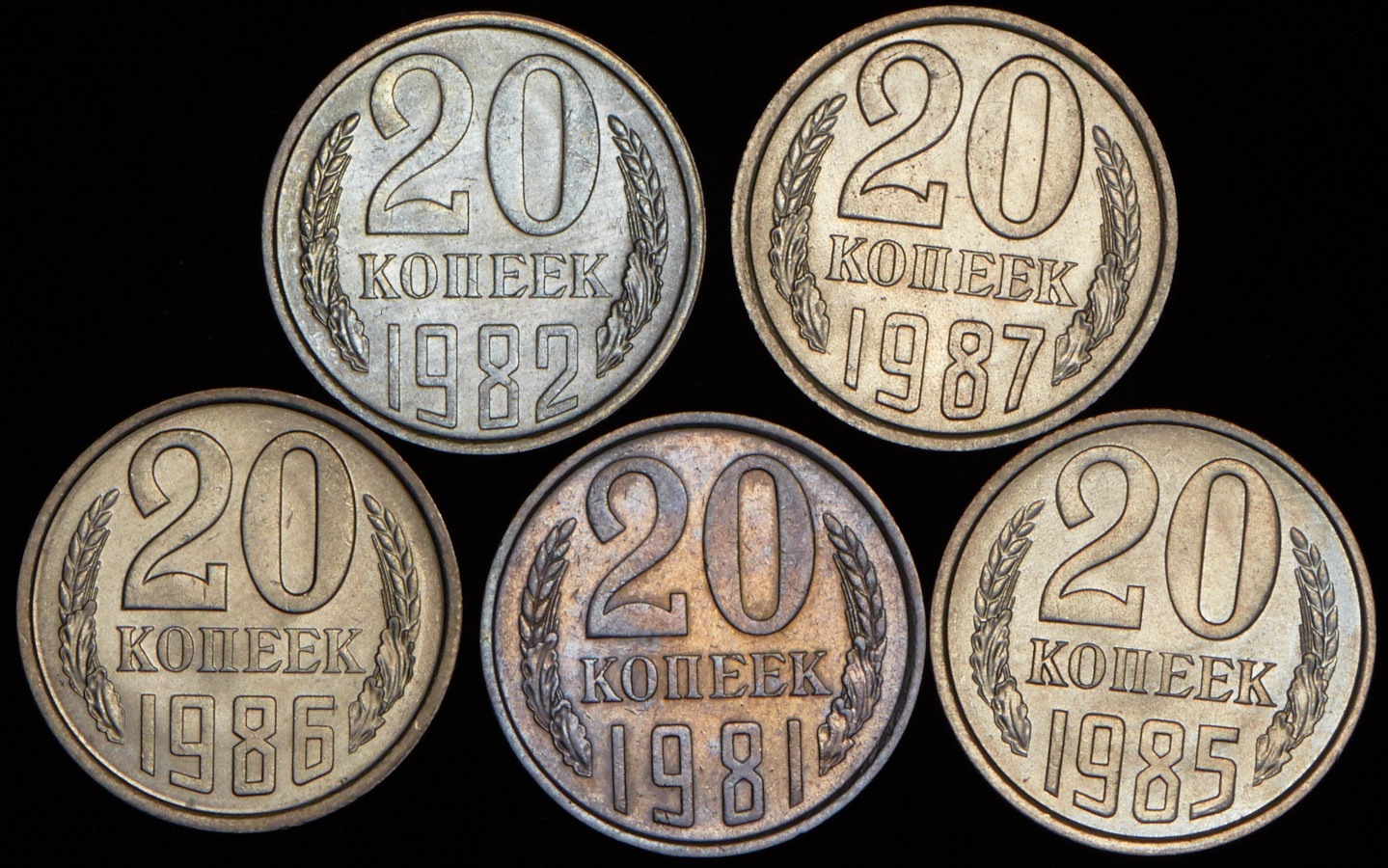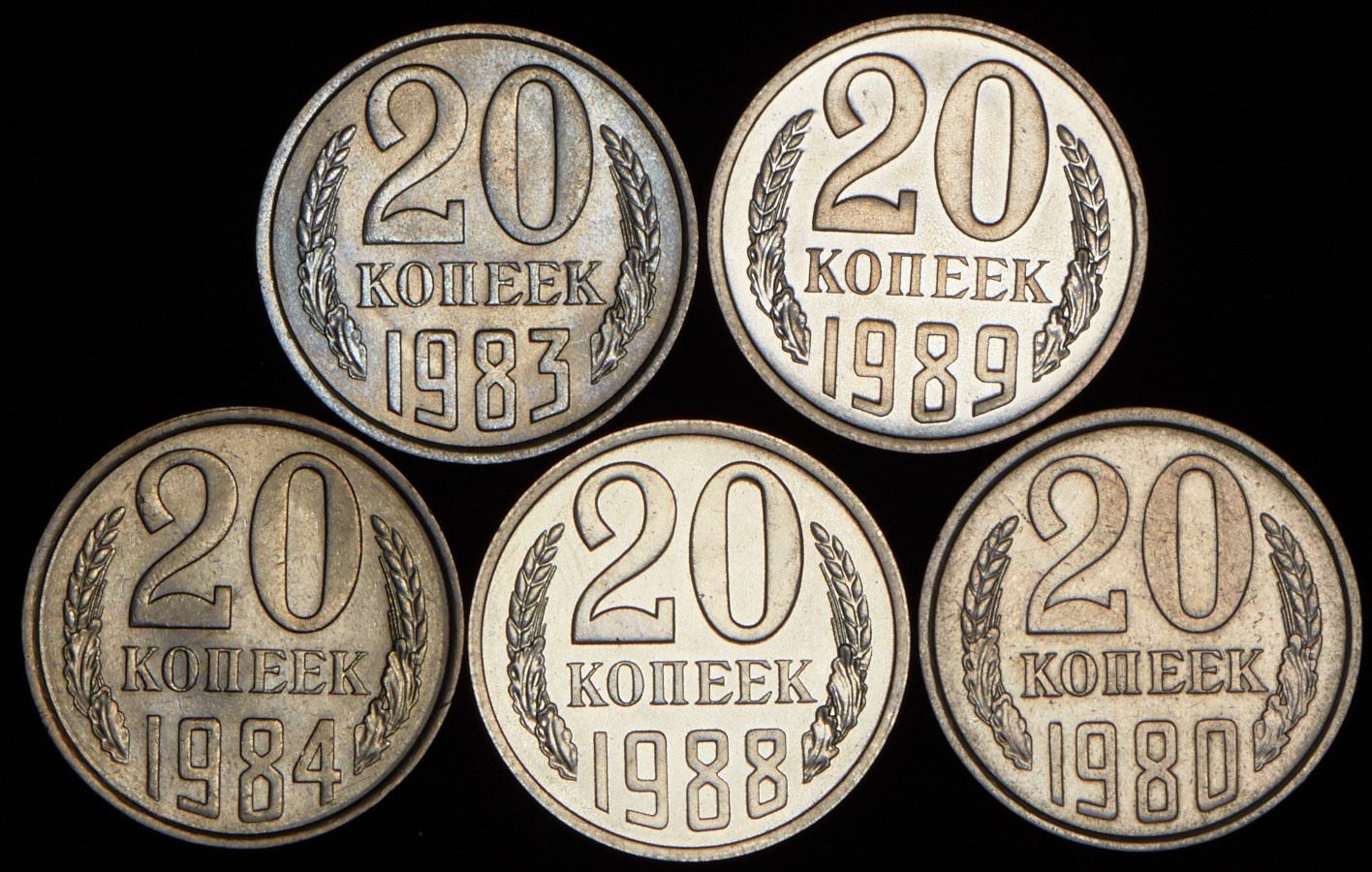Набор из 10-ти монет 20 копеек 1980-х (СССР)