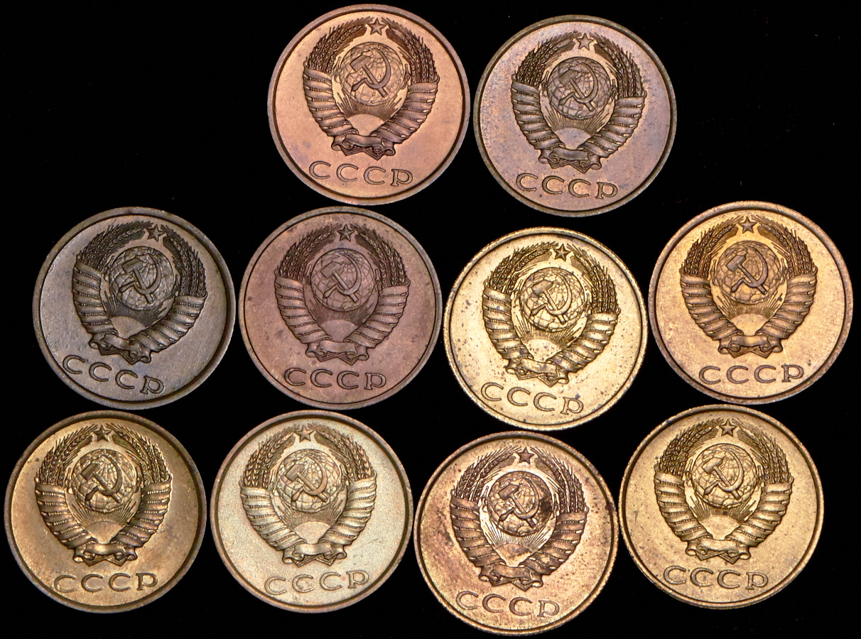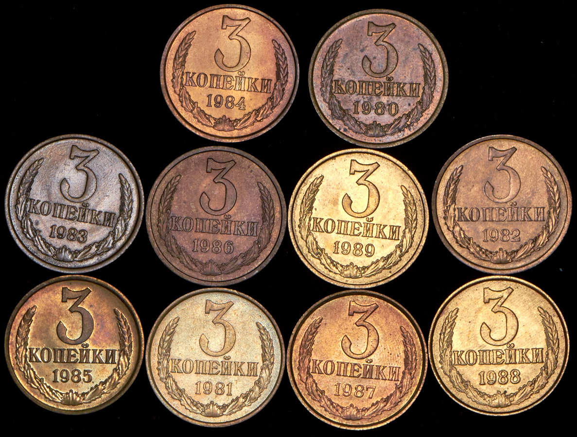 Набор из 10-ти монет 3 копейки 1980-х (СССР)