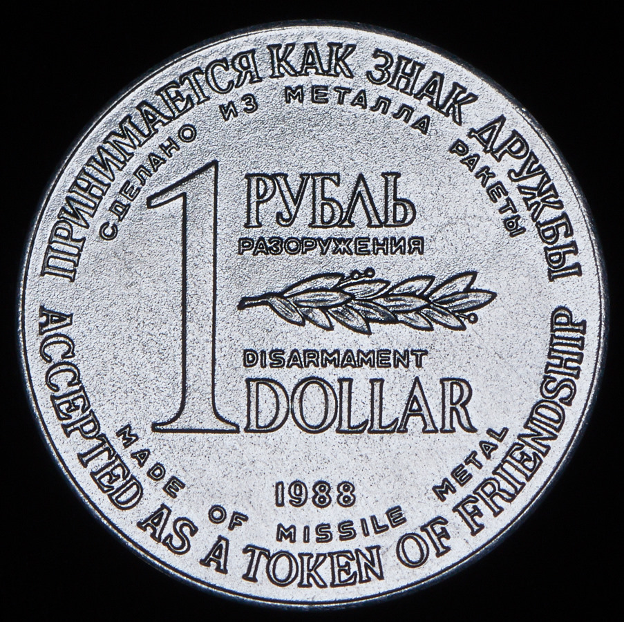 Изготовлен в 1988 году из металла советских ракет средней дальности Р-12 (сплав алюминия с титаном), уничтоженных согласно советско-американскому договору по РСМД (Договор о ликвидации ракет средней и малой дальности, вступивший в силу 1 июня 1988 года). Металл не представляет опасности для здоровья. Самый первый выпущенный жетон был подарен американскому президенту в знак примирения. Выпуском этой монеты-жетона ознаменовался период окончания «холодной» войны между СССР и США. Монеты-жетоны были преподнесены Рональду Рейгану и Михаилу Горбачеву как авторам договора, президенту Дж. Бушу, мэрам городов Хиросима и Нагасаки, пострадавшим от атомной бомбардировки, бывшим президентам США Д. Форду и Дж. Картеру, премьер-министру Великобритании М. Тетчер и другим.