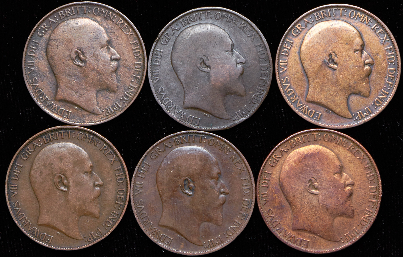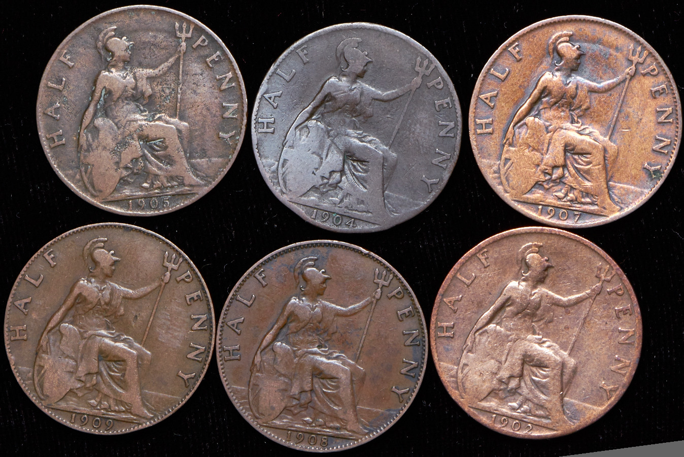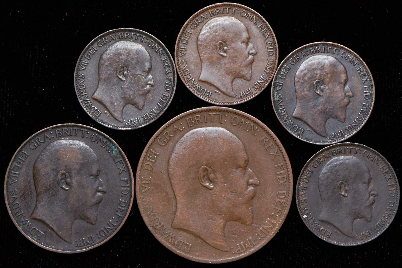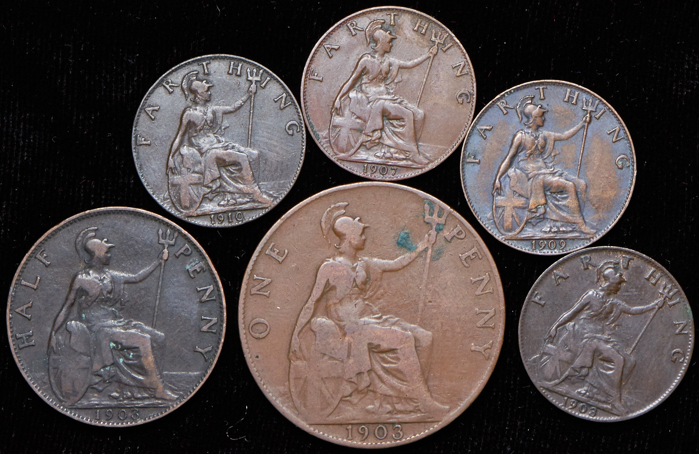 VG-XF. 1 пенни 1903, 1/2 пенни 1902, 1903, 1904, 1905, 1907, 1908, 1909, 1 фартинг 1903, 1907, 1909, 1910.