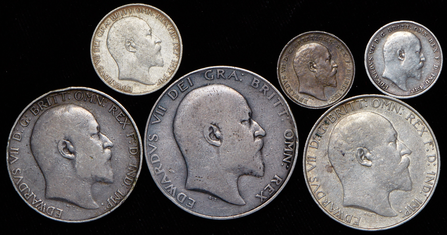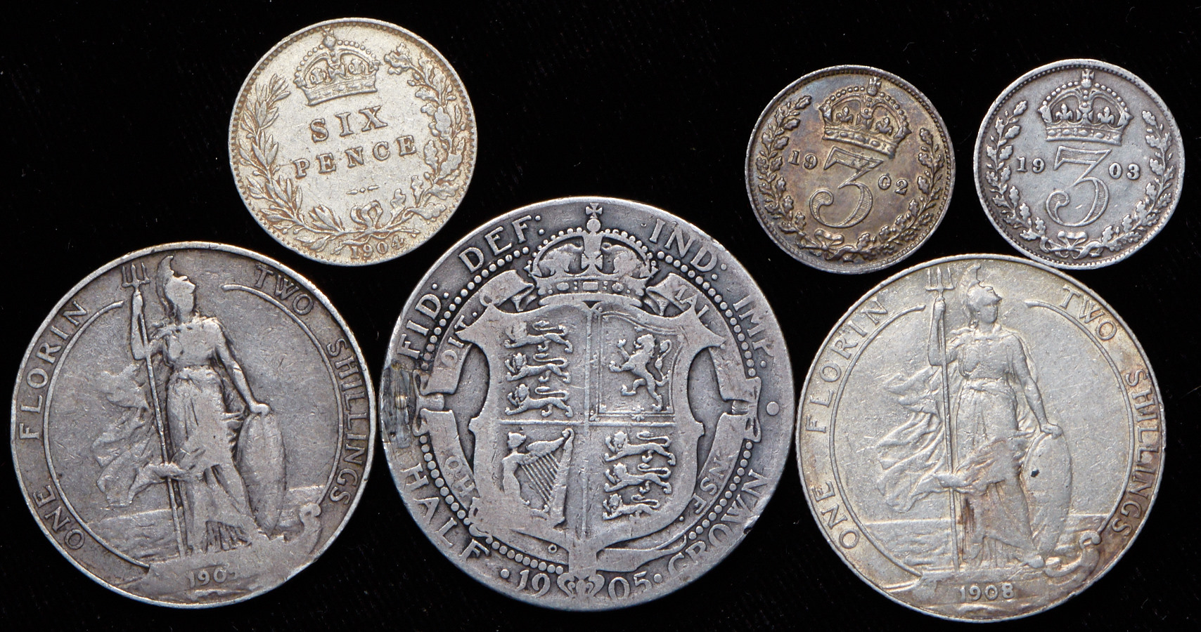 VG-XF. 1/2 кроны 1905, 1 флорин 1908, 1909, 6 пенсов 1904, 3 пенса 1902, 1903.
