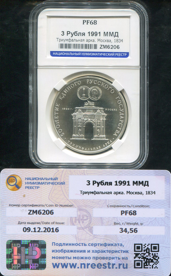 3 рубля 1991 "Триумфальная арка" (в слабе) ММД