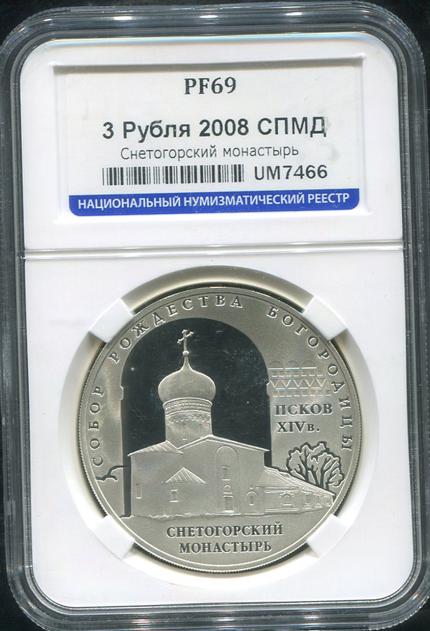 3 рубля 2008 "Собор Рождества Богородицы Снетогорского монастыря (XIV в.), г. Псков" (в слабе) СПМД