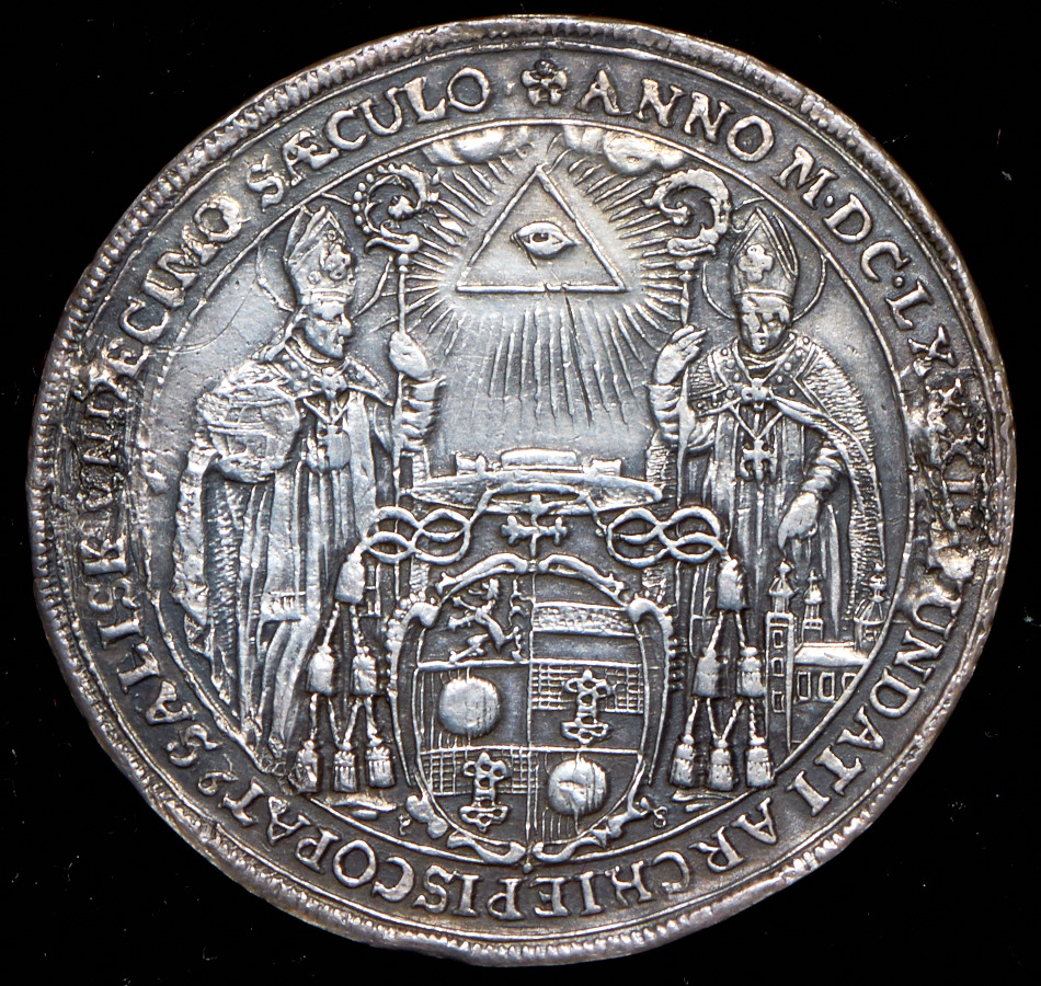 На авресе иображены две стоящих фигуры (святой Руперт и святой Виргилий), между ними герб, над которым - всевидящее око. Подпись PS по сторонам герба. Легенда аверса "ANNO MDCLXXXII FUNDATI ARCHIEPISCOPAT9 SALISB VNDECIMO SAECULO".