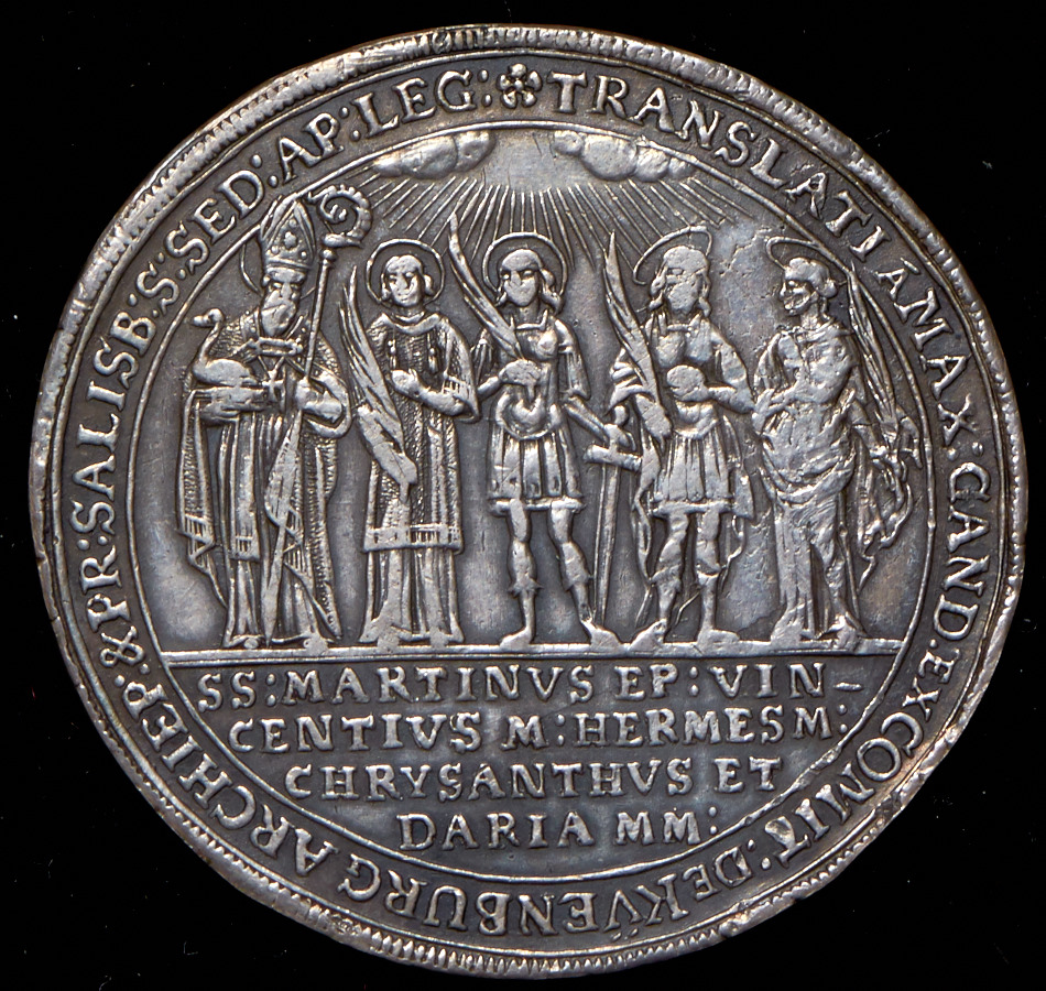 Легенда реверса "TRANSLATI A MAX GAND EX COMIT DE KÜENBURG ARCHIEP & PR SALISB S SED AP LEG", "SS MARTINUS EP VINCENTIUS M HERMES M CHRISANTVS ET DARIA MM".