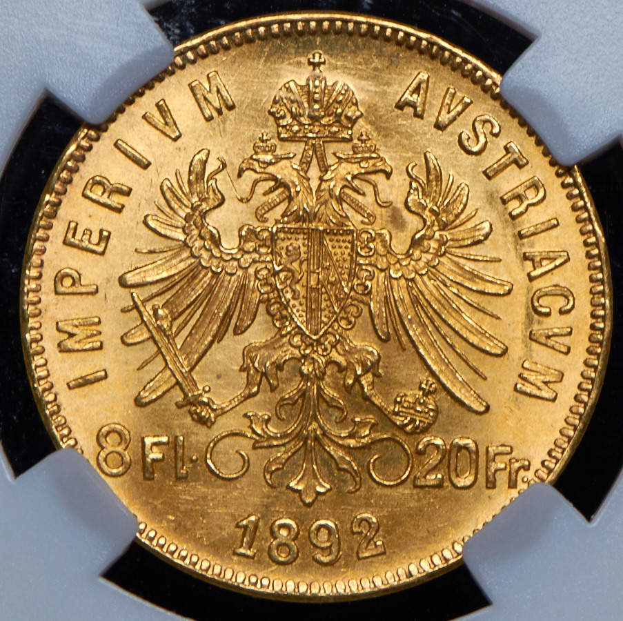 8 флоринов - 20 франков 1892. Рестрайк (Австрия) (в слабе)