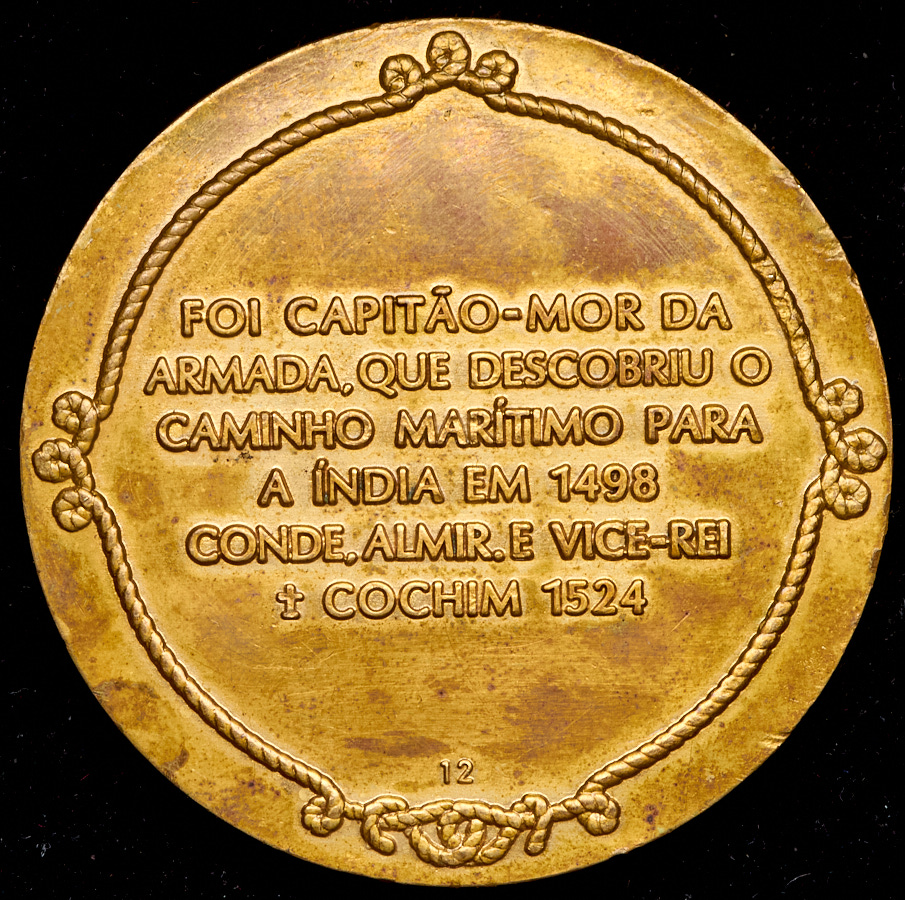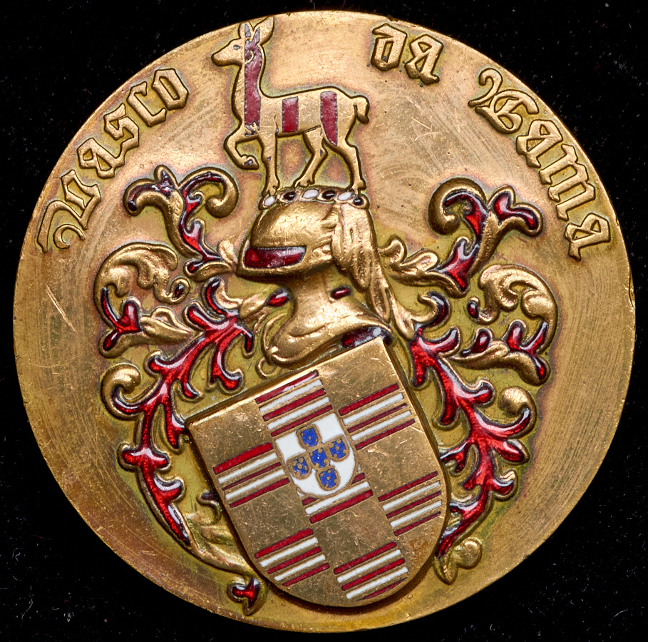 Медаль в память португальского мореплавателя Васко да Гама (Vasco Da Gama). На аверсе изображён герб на щитке под рыцарским шлемом в обрамлении перьев. На реверсе изречение о его заслугах. На гурте надпись: 80 \ 1000 –J.P.ABREU LIMA –DES.-GRAVERTE –LISBOA-. Португалия. Бронза, позолота, эмали: синяя, красная и белого цветов. Диаметр 50 мм