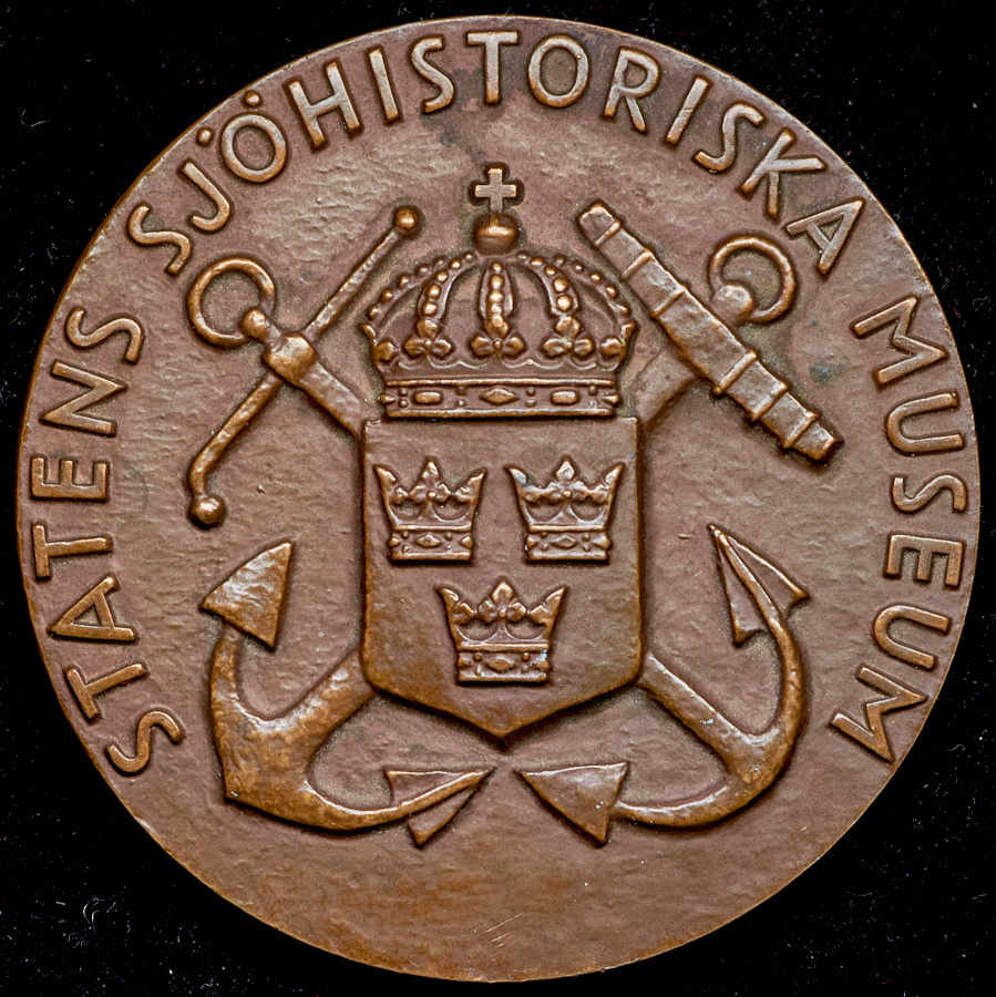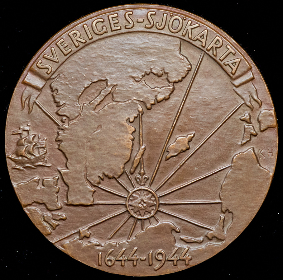 Медаль в память 300-летия появления карты Швеции. Statens Sjohistoriska Museum (Государственный исторический музей Швеции). Sveriges - sjokarta 1644-1944. Швеция. На гурте клеймо: «SPORRONG & C» Бронза. Диаметр 59 мм