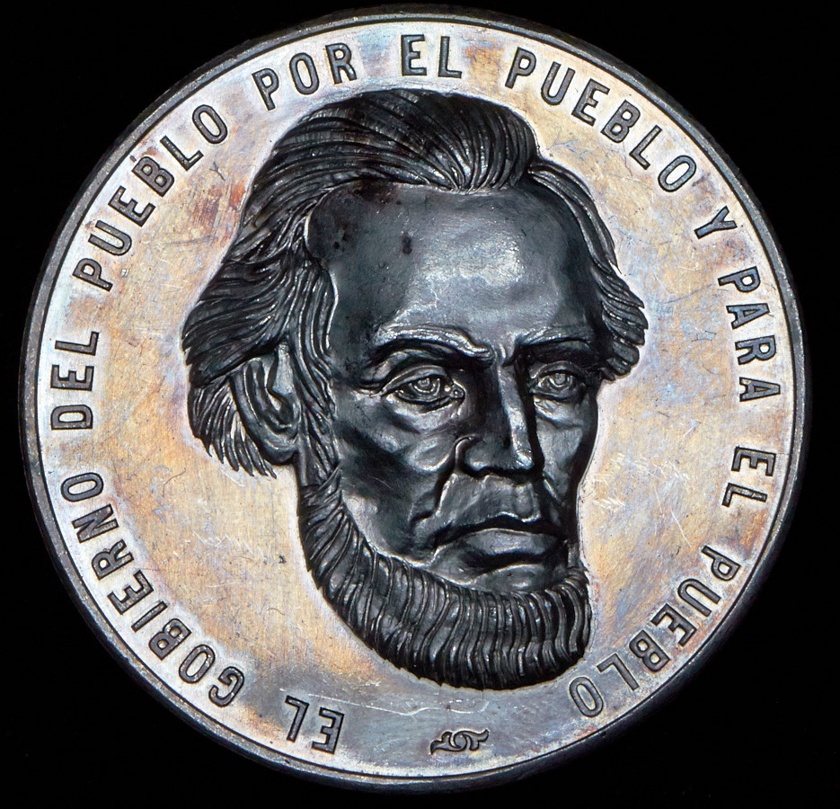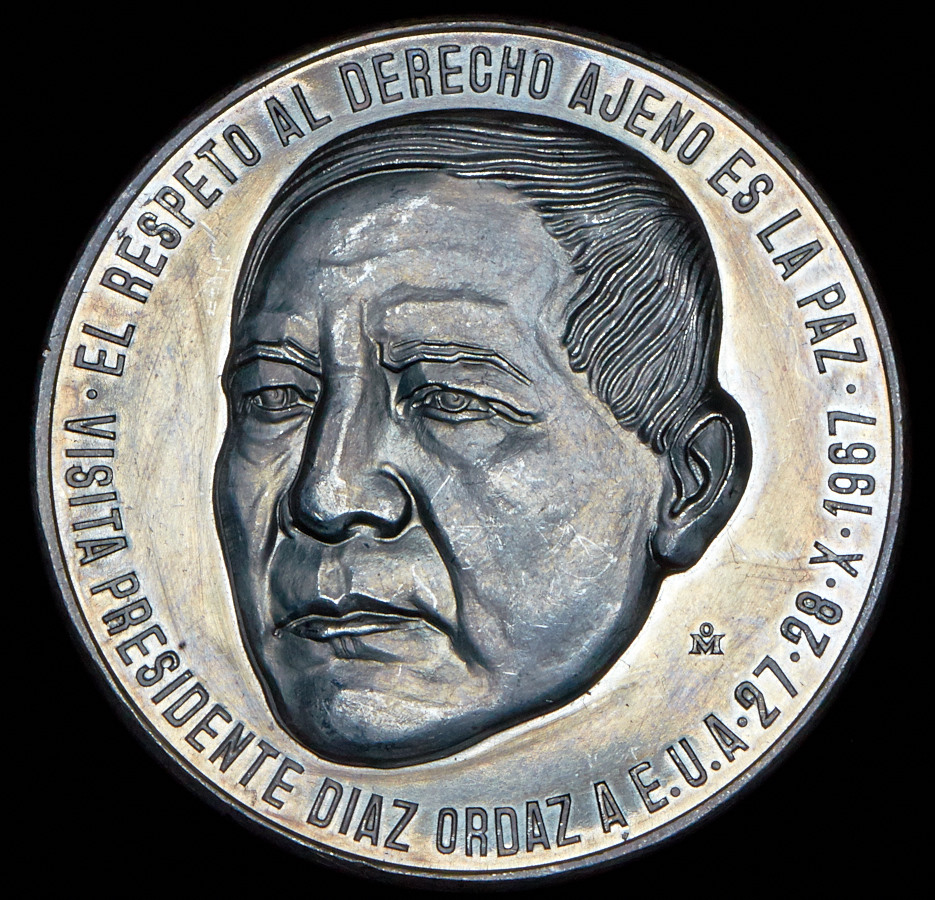 Легенда аверса вверху "el respeto al derecho ajeno es la paz" (уважение прав других - это мир), внизу "visita presidente diaz ordaz a e. u. a. 27 28 Х 1967"