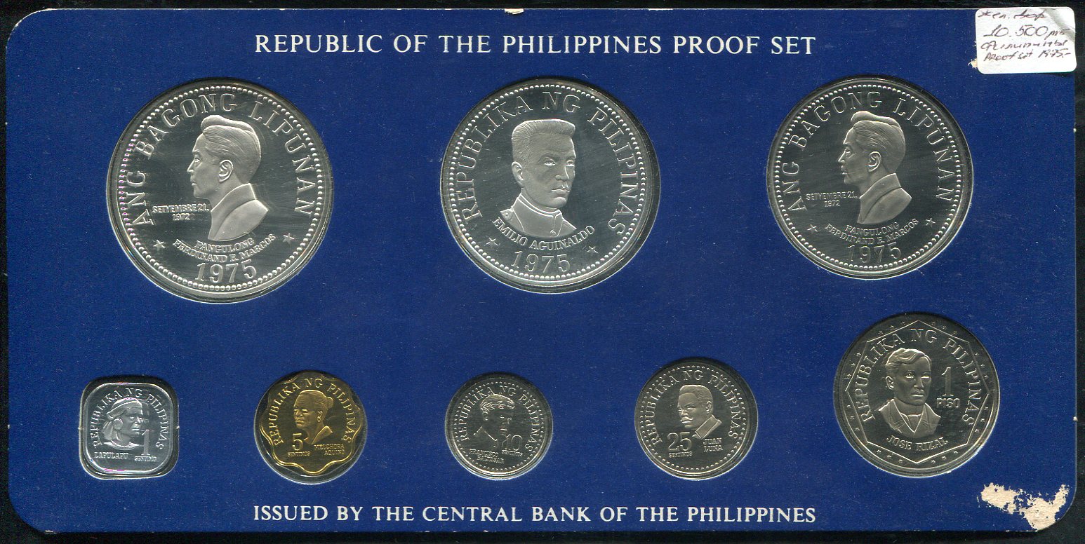 Памятный набор монет Филиппин 1975 года нового дизайна, отчеканенные в улучшенном качестве на монетном дворе Франклина (штат Пенсильвания, США) с санкции правительства этой страны.