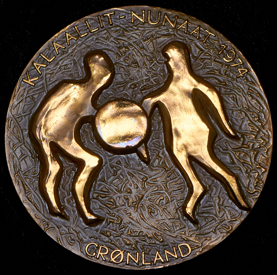 На оборотной стороне древний гренландский наскальный рисунок, изображающий двух мужчин, танцующих под инуитский барабан. Kalaallit-Nunaat 1974.