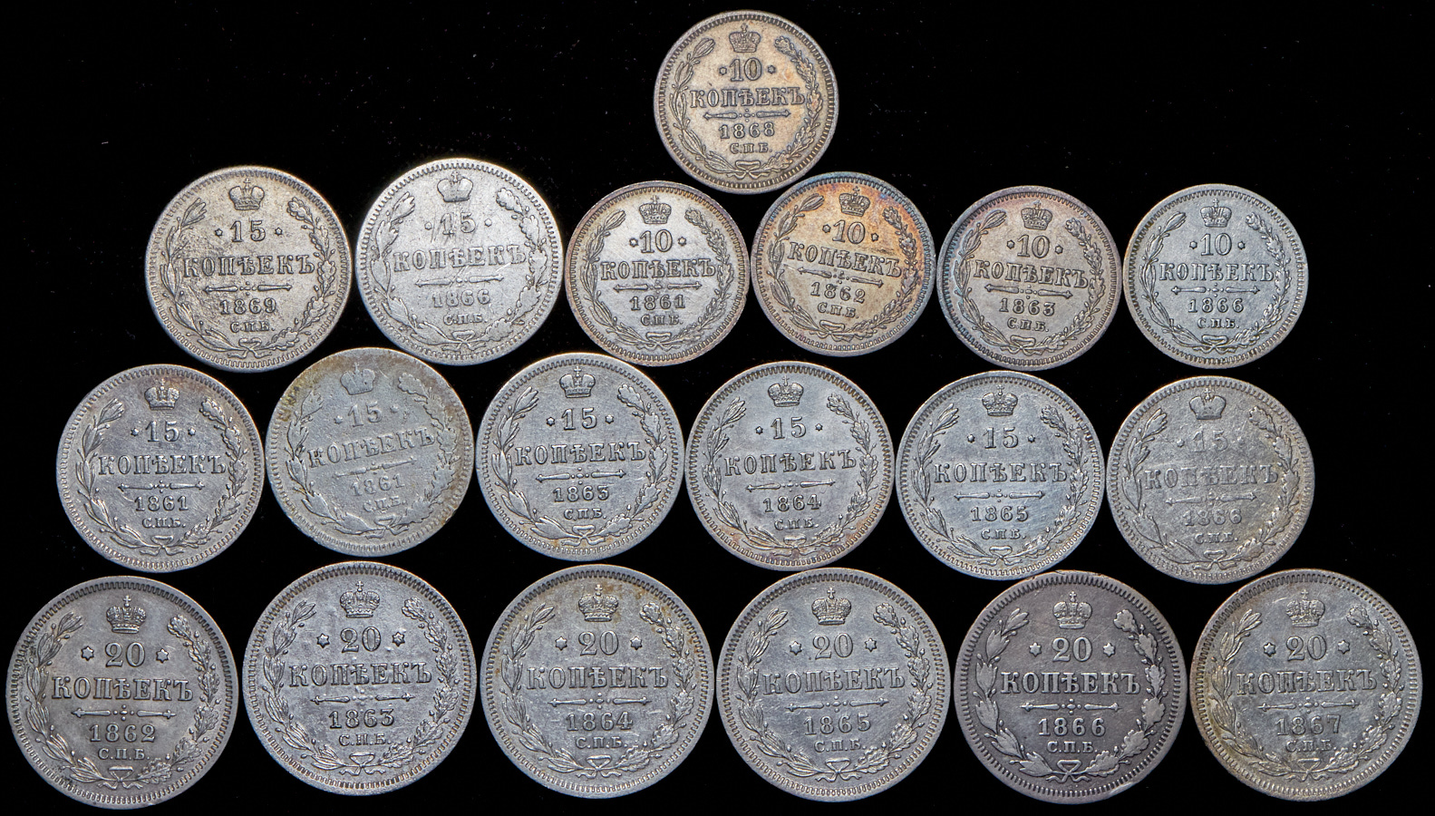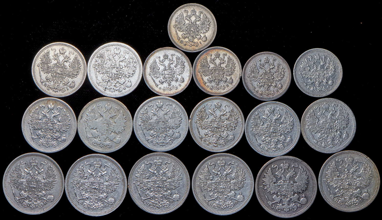 VG-XF.20 копеек - 6 шт. 15 копеек -8 шт. 10 копеек - 5 шт.