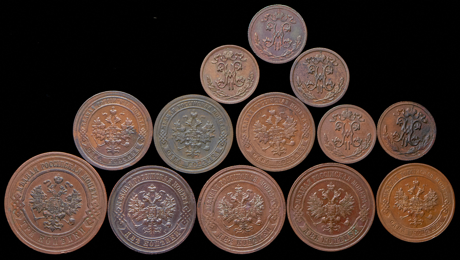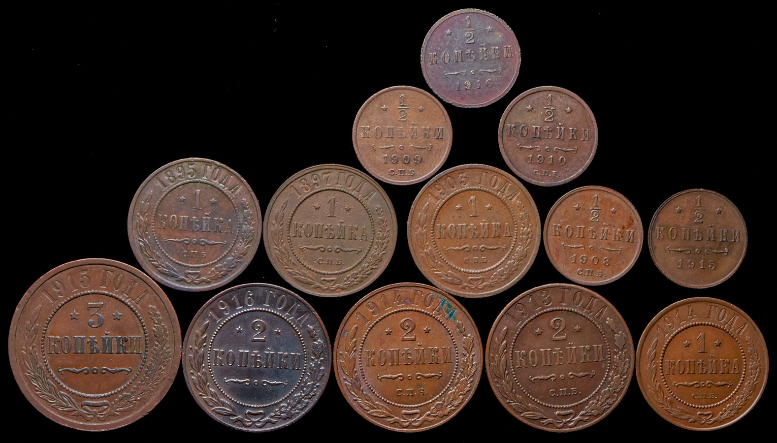3 копейки 1915, 2 копейки 1914, 1916, 1913. 1 копейка 1897, 1895, 1903, 1914 1/2 копейки 1916, 1915, 1908, 1909, 1910