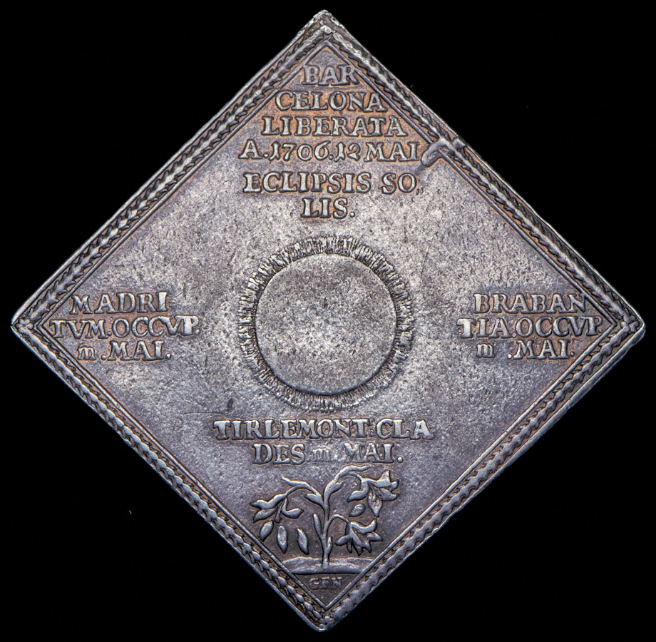 Легенда реверса "BAR // CELONA / / LIBERATA / / A.1706.12 MAI // ECLIPSIS SOL= // IS", "MADRI= // TVM.OCCVP. // m. MAI.", "BRABAN // TIA.OCCVP. // m. MAI.", "TIRLEMONT CLA=DES. m. MAI".