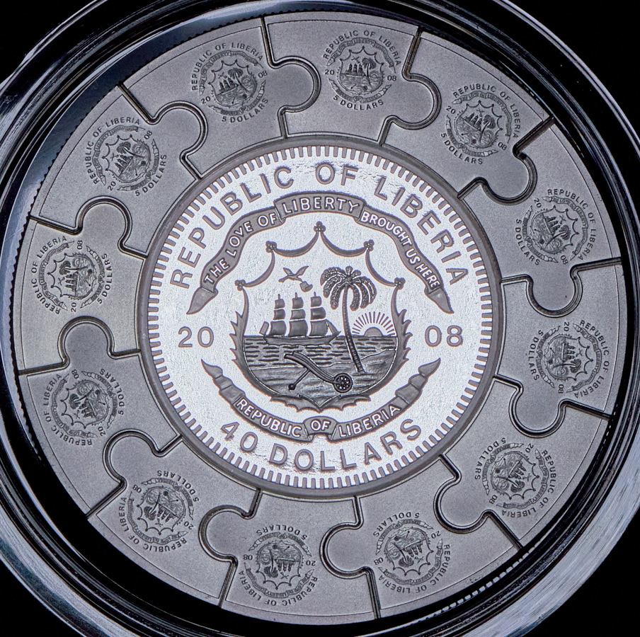 Монета-пазл: центральная часть - монета 40 долларов (PROOF), 12 частей по 5 долларов (UNC).