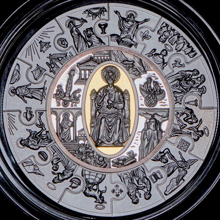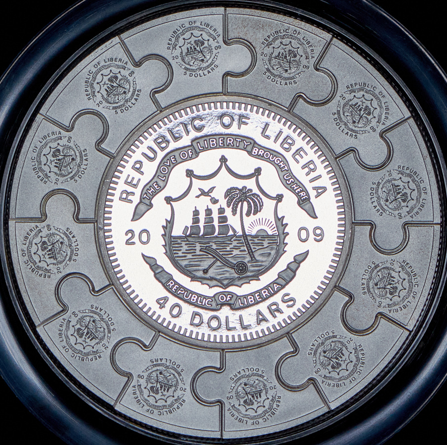 Монета-пазл: центральная часть - монета 40 долларов (PROOF), 12 частей по 5 долларов (UNC).